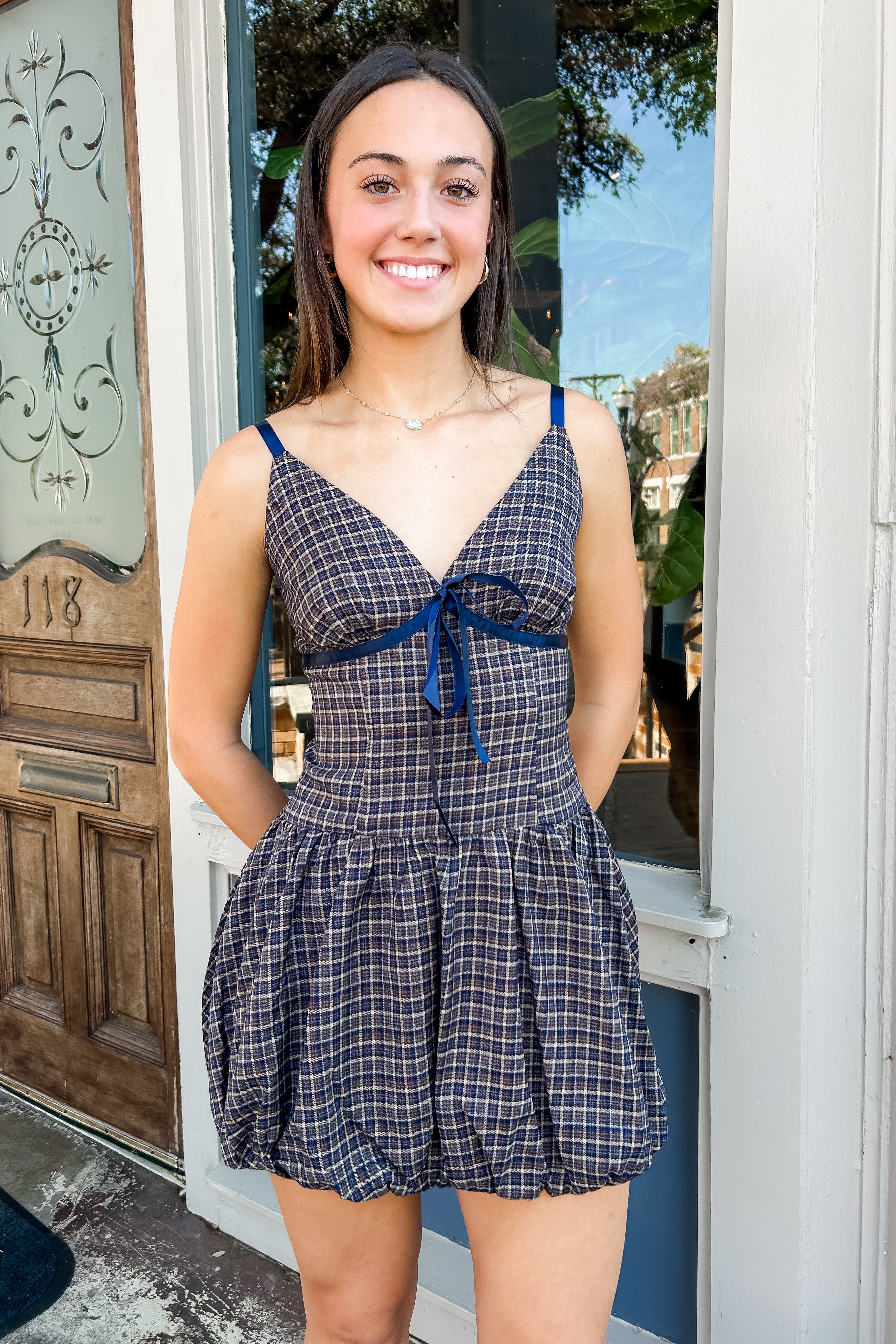 Brown-Navy Plaid V-Neck Bubble Mini Dress